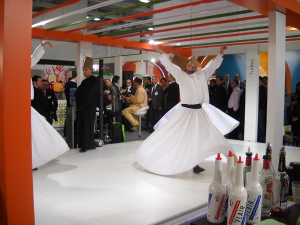 Spectacle original sur le pavillon de la Turquie avec une représentation de derviches tourneurs qui attire un public nombreux. Le public se masse autour de la piste de danse et applaudit chaleureusement cette manifestation inédite.