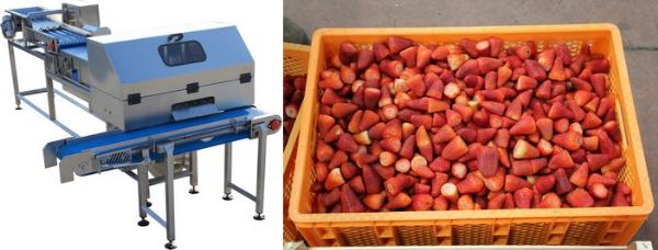 La machine a été conçue pour éliminer la partie verte de la fraise et la couper par moitié si nécessaire. Ce système, pour lequel une demande de brevet a été déposée, peut également être utilisé pour équeuter les radis.