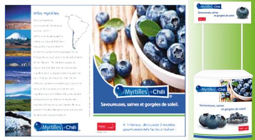 Sur les lieux de ventes : dégustation produit et mise à disposition de leaflets (20 000 exemplaires) à destination des clients. Ces leaflets présentent les Myrtilles du Chili, donnent des conseils de préparation et de conservation ainsi que 2 recettes culinaires faciles à réaliser.