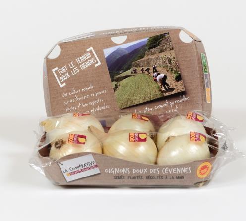 Une barquette carton de 3 ou 6 oignons, protégée par un film flow pack. Ce type de présentation est totalement inédit en oignon. En se rapprochant d'une logique fruitière, l’objectif est de monter en gamme pour affirmer un positionnement hautement qualitatif et gagner en visibilité dans le rayon frais. Le conditionnement en carton contient également des informations sur la production artisanale et des recettes faciles à réaliser (soupe, tarte, oignons farcis ...).
