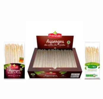 L’asperge Priméale est proposée en sachets fraîcheur de 500g, 750g et 1kg, en colis vrac de 2kg et 5kg et pour la 1ère fois en carton « Prêt à vendre » de 5 kg. Ce carton facilite l’achat en vrac et valorise l’offre Priméale en rayon. En complément une offre biologique, labellisée AB sous la marque Prim’Bio.