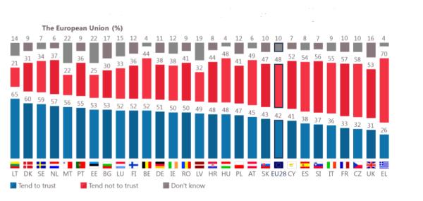 L'enquête Standard Eurobarometer (EB90) de l'automne 2018, sondage réalisé dans les États membres, démontre selon la Commission Européenne que la confiance dans l'UE reste stable : plus de 4 citoyens de l'UE sur 10 déclarant avoir « plutôt confiance » dans l'UE.