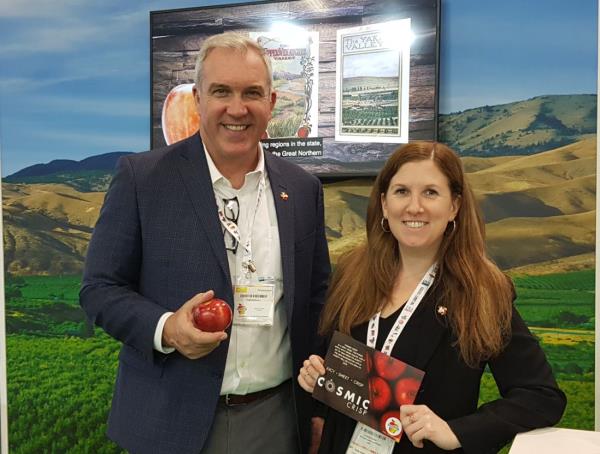 À Fruit Logistica à Berlin, les visiteurs ont eu l'occasion d'essayer une nouvelle variété de pomme, croisée entre Honeycrisp et Enterprise, appelée Cosmic Crisp®. La nouvelle pomme offre un bon équilibre entre la saveur et la texture, et le stockage le plus long avec une résistance naturelle au brunissement. "C'était la 1ère année pour récolter Cosmic Crisp® et la récolte était d'environ 346 000 boîtes. La récolte est limitée et se vend très rapidement. L'année prochaine, nous nous attendons à ce que le nombre soit plus proche de 2 à 2,2 millions de boîtes, et l'année d'après 6 à 7 millions. Nous appelons ça le Cosmic Crisp/Tsunami. Ça vient très vite. "