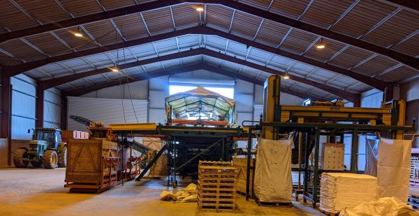 Ces pommes de terre arrivent dans des hangars où sont traités également les oignons, les betteraves à sucre, les haricots et les pois produits par l'exploitation agricole. La production annuelle atteint 12 000 tonnes de pommes de terre, dans une dizaine de variétés et dans une gamme de calibres comprise entre 28 et 80 mm.