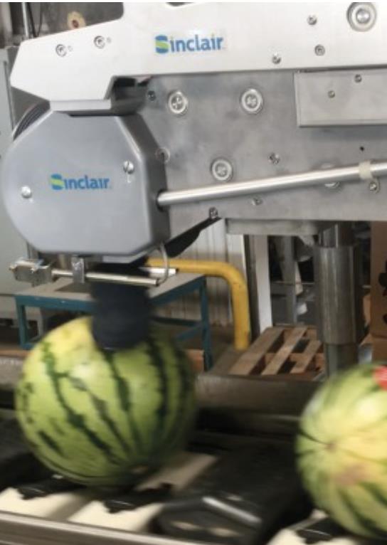 Sinclair a automatisé le processus d'étiquetage des pastèques, citrouilles et choux avec sa Large Label V6 (LLV6) brevetée. La machine est capable d'étiqueter jusqu'à 400 fruits par minute. Sa technologie "hit-on-sight" et son soufflet à contact doux permettent à la LLV6 d'appliquer facilement et rapidement des étiquettes approuvées pour les aliments. Le système d'étiquetage LLV6 de Sinclair peut être adapté aux systèmes existants de calibrage, de triage et de convoyage.