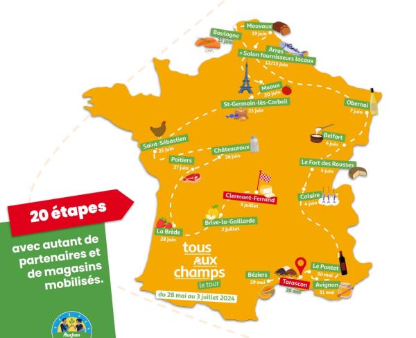 Du 28 mai au 3 juin Auchan Retail se lance sur les routes de France à la rencontre de sea partenaires filières et producteurs locaux. Après le succès des premières éditions, Auchan reprend la route pour un nouveau tour de France. L’enseigne emmène ses collaborateurs, ses clients et ses partenaires à la découverte des producteurs, agriculteurs, éleveurs… avec qui elle cultive le bon, le sain et le local. Auchan souhaite ainsi mettre en lumière les hommes et femmes passionnés qui nous permettent de proposer dans sess magasins le meilleur de ses terroirs.