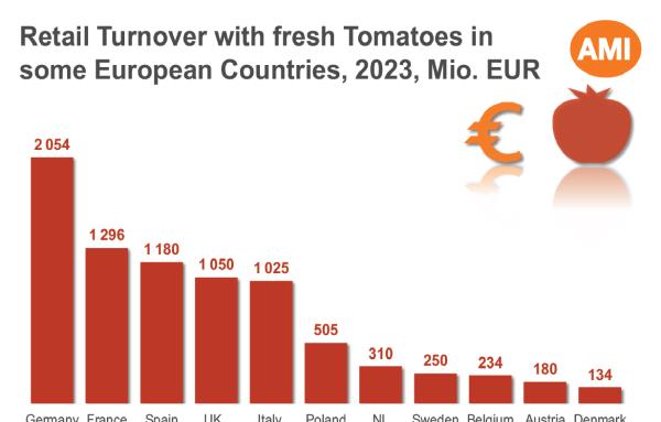 Lorsqu'on compare la consommation annuelle de tomates par foyer, l'Espagne arrive de loin en 1ère position avec 27,9 kg et une valeur de 61,8 EUR, selon AMI, GfK et KantarWorldpanel. Suivent dans ce classement en volume, la Pologne avec 18,4 kg/an par foyer, la France 13 kg, l'Italie 12,7 kg, l'Allemagne 12,7 kg, la Belgique 11,1 kg. Si l'on compare la valeur de la consommation par ménage, le classement change : l'Allemagne passe à la 2ème place après l'Espagne avec 50,5 EUR de dépenses annuelles par ménage, suivie par la Suède et le Danemark qui dépensent à égalité 46,4 EUR, puis la Belgique 45,2 EUR, l'Italie 40,1 EUR, la Pologne 39,9 EUR, les Pays-Bas 38,1 EUR et le Royaume-Uni 37 EUR.