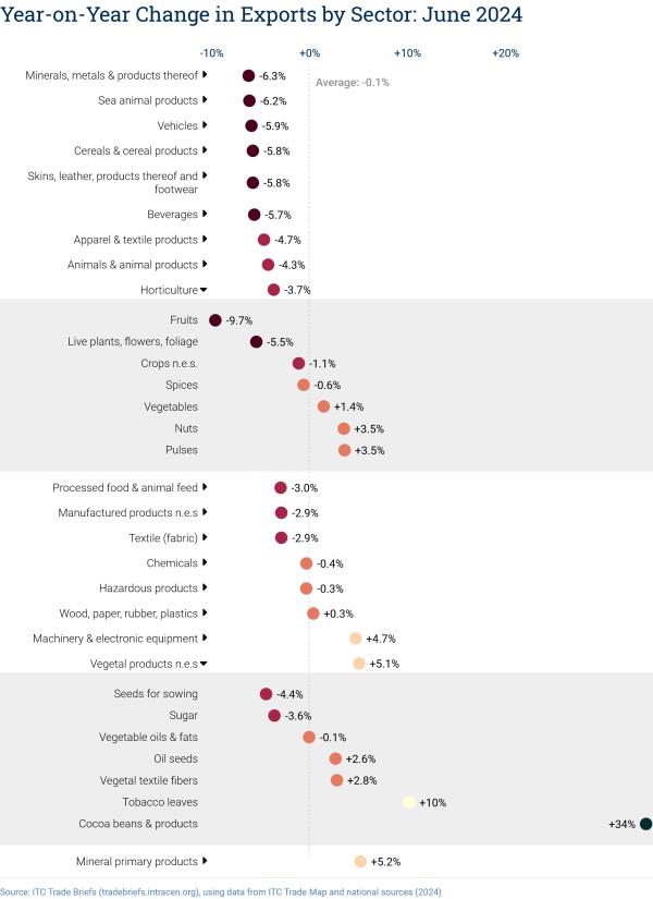 Dans l'ensemble, les exportations de produits agricoles, de produits de la pêche et de produits alimentaires ont chuté de 2,5 % par rapport à l'année précédente. Au sein de ces industries, les performances à l'exportation d'une année sur l'autre ont été les plus fortes pour les produits minéraux primaires, avec des exportations en hausse de 5,2 %, et les plus faibles pour les minéraux, métaux et produits dérivés, avec des exportations en baisse de 6,3 %.